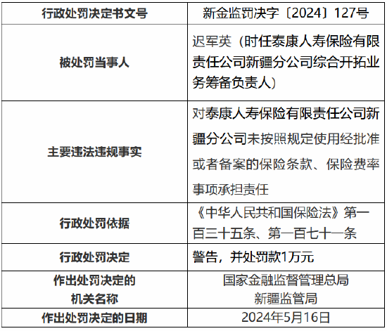 时任泰康东谈主寿保障有限牵涉公司新疆分公司概括开采业务规划肃肃东谈主迟军英,对公司未按依法程使用经批准冒昧备案的保障条目、保障费率事项承担牵涉,受到劝诫,并被罚金1万元。