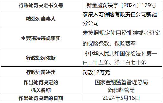 5月24日金融一线音书,国度金融监督科罚总局新疆监管局行政处罚信息公开表表示,泰康东谈主寿保障有限牵涉公司新疆分公司因未按依法程使用经批准冒昧备案的保障条目、保障费率,被罚金12万元。