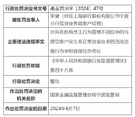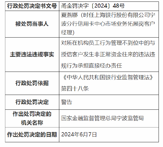 6月14日金融一线音问,国度金融监督处置总局宁波监管局公布行政处罚信息公开表透露世博shibo登录入口,上海银行股份有限公司宁波分行波及以下犯警违纪事实:1.贷款“三查”不尽责;2.信贷资金违纪流入划定性界限;3.代销业务处置不到位;4.单据业务处置不审慎;5.职工举止处置不到位。