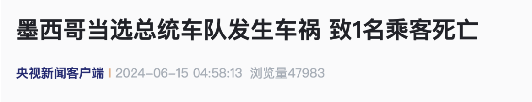 总台记者获悉,当地技艺6月14日上昼,墨西哥当选总统辛鲍姆的车队在墨西哥北部科阿韦拉州的高速公路上发生车祸世博体育,现在仍是变成至少1东说念主逝世,另有至少3东说念主受伤。据了解,辛鲍姆并莫得乘坐事发车辆。