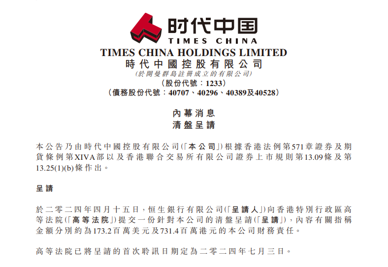 4月16日早间,广东房企期间中国控股有限公司(期间中国控股,01233.HK)发布对于清盘呈请的公告。