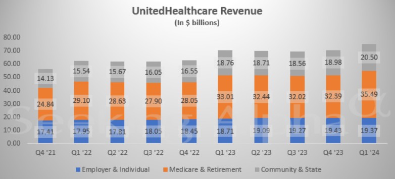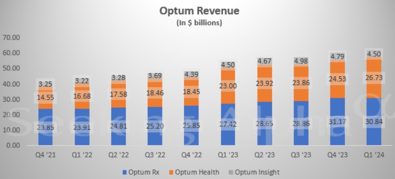 UnitedHealth由两个主要业务部门构成:Optum和UnitedHealthcare。据Optum网站先容,该公司为约1.03亿耗尽者提供一系列药房作事、谈判作事和医疗作事。Optum公布第一季度收入为611亿好意思元,高于旧年同期的541亿好意思元。集合健康示意,由于作事东谈主数的“建壮延迟”,Optum的收入增长主要来自其患者照管和药房部门。